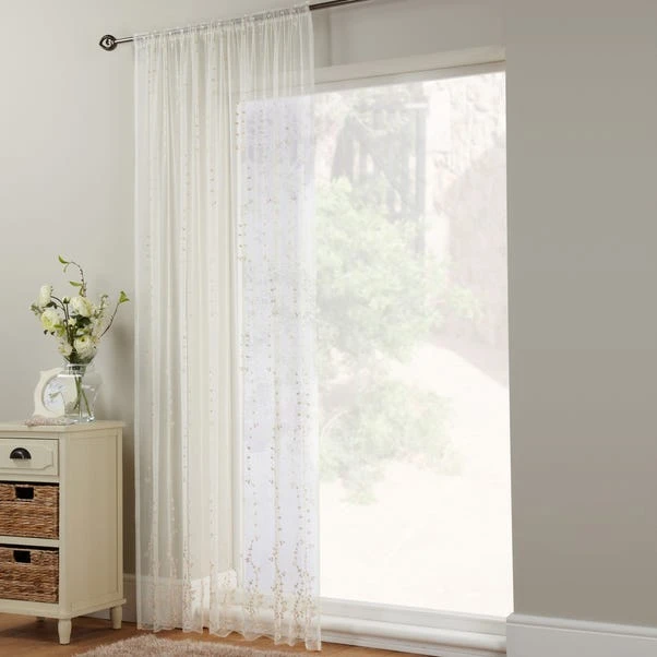 Available in multiple drop lengths, this cream voile panel is embroidered with rosebud patterning and finished in a natural cream colourway.